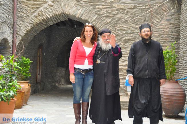 In het klooster wonen op dit moment drie monniken. De oudste monnik, Evdokimos, is erg bekend om zijn vriendelijke gastvrijheid en de beroemde pasta die hij voor zijn gasten maakt. Hij heeft hier jarenlang onder zware omstandigheden alleen gewoond, want er was heel lang geen goede weg die naar het klooster leidde. Nu is dit wel het geval en het klooster krijgt dagelijks veel eilandbewoners, waaronder veel jongeren, op bezoek. De kerk bij het klooster is recent helemaal gerenoveerd en van binnen gedecoreerd met prachtige schilderingen. Zeer de moeite waard om te bekijken. Het uitzicht vanaf het klooster op de vallei, Chora en de zee is adembenemend.
