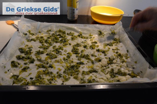 De gesnipperde ui en de in ringetjes gesneden bosuitjes zachtjes bakken in de extra vergine olijfolie. De in ringen gesneden prei toevoegen. Peterselie en dille toevoegen. Zout erbij. Ondertussen in een kom de feta verbrokkelen. In een andere kom de vier eieren kloppen met een kop melk. Dit bij de verbrokkelde feta doen. De prei even laten afkoelen. Als er nog veel vocht bij de prei zit even laten uitlekken in een vergiet.