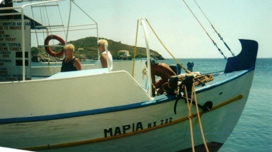 Vrijwel iedere vakantie maken we een boottocht. Met de Maria, een houten scheepje, doen we een excursie met rondleiding naar het noordelijk gelegen eilandje Inousses. Alwaar een bezoek aan het klooster, hoog tegen de bergflank; Een hele klim langs driehonderd treden. Heel amusant was de verkleedpartij, want alle bloot moest bedekt, veel te krappe of te ruime kleding. In de broekzak van buur Nico zat nog een oud kombouloi; speelketting uit 1920. Alvorens de zware poort open gaat, wordt er nog een roerend verhaal verteld over een ziek meisje. Ze lag in een glazen kist, alleen een klein handje was zichtbaar. De vrouwen waren onder de indruk. Waar we alle vier ook van onder de indruk waren, was het ritje