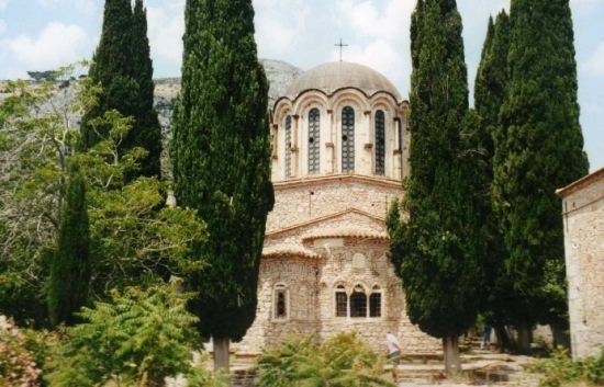 Het is een prachtig klooster, in een mooie omgeving tegen een kale bergwand, omringt door statige cipressen. In een kleine kapel staan twee kasten vol schedels van monniken die tijdens een bloedbad van 1822 om het leven kwamen. Een eng gezicht en de vrouwen griezelden er van.