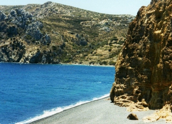 Aan de zuidkust ligt Emporios. Er is een zwart lavastrand; Mavros Gialos. Het dorp heeft een prachtige baai. Het zandstrand is donker grijs. We dalen het natuurstenen verspringend pad af en nemen een kijkje. Aan de linker kant van de haven verheft zich de uitgebluste vulkaan Psaronas, de veroorzaker van het zwarte gesteente en zand dat de stranden bedekt; erg imposant. Op een van de terrasjes laten we alles rustig op ons inwerken.