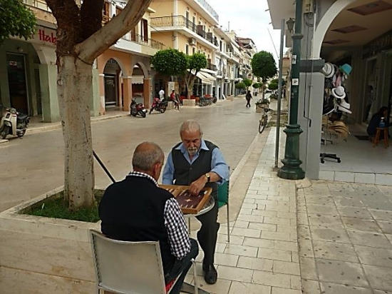 Pal ernaast staat de kerk. We fietsen kriskras door de stad. De winkelstraat is verboden voor auto’s. Veel winkeltjes, met een boogoverkapping ervoor. We stallen de fietsen achter een kiosk en gaan lopend verder, tot aan het gezellige St. Markosplein, met veel winkels en, taveernes met terrassen. We hoeven dan ook niet lang na te denken om op een ervan te gaan zitten. De serveerster neemt alle tijd. Van ons mag het, er is hier genoeg te zien. Op de terugweg lopen we onder de overkapping door. Er is een keur aan winkels, meer dan er op dit moment aan toeristen zijn.Langs de straatkant zitten twee oude Griekse mannen, gemoedelijk een spelletje triktrak te spelen. Meestal een gebruikelijk beeld bij de cafés. In de schaduw van de boom trekken ze zich van niemand iets aan. Ze hebben gelijk. Ik blijf even staan kijken en maak stilletjes een foto. Ze schuiven de stenen in gedachten verzonken en behoedzaam over het bord.