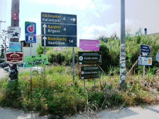Een fietstocht naar laganas stond ook op het programma. Links van de weg staat een aanduiding dat het 5 kilometer verder is. Het begin is licht glooiend, maarde weg gaat door een schitterende omgeving. In een olijfgaard bij een witte kapel lopen zelfs een aantal paarden. In een gestadig tempo trappen we verder. We stoppen even in een duingebied voor Kalamaki, bij een pad dat naar zee afloopt. Op een bord staat dat er zeeschildpadden zijn. De toegang naar het strand is gesloten. Uit een wachthokje komt iemand naar ons toe. Het stuk strand is beschermd. We hebben er alle begrip voor. Na Kalamaki loopt er door een bosrijke omgeving zelfs een fietspad langs de weg. Rechts van die weg ligt het vliegveld. De omgeving is begroeid met paarse bloemen.