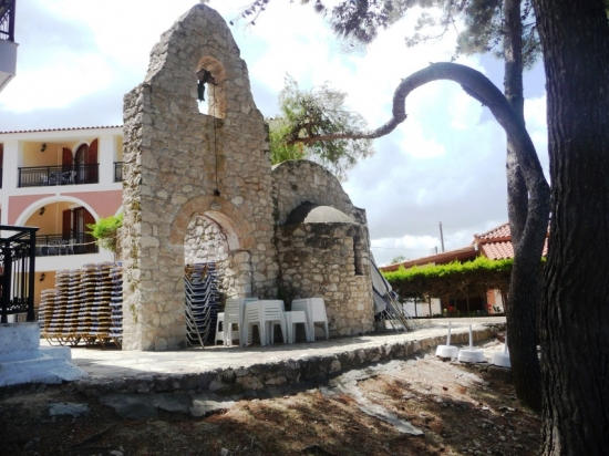 Het stukje strand dat achter de hotels en de hoofdstraat loopt, wordt vanaf het kerkje bij de afslag, naar Laganas, steeds smaller. Toch is het de moeite van een strandwandeling waard. Hoewel het woordje strand een tikkeltje overdreven is. Bijna overal staat een lange stenen muur opgetrokken tegen de zee. In de tuin van een luxueus hotel is een kleine kapel helemaal ingebouwd.