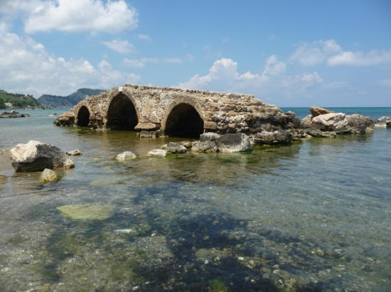 Waar vroeger de houten bidstoeltjes stonden, staan nu parasols, stoeltjes en strandbedden opgestapeld. Ook hier heeft de nostalgie zijn tol betaald. Maar iets verderop staan de laatste brokstukken van een oude brug uit 1805. Ooit liep hier een verbindingsweg. Ik kan me geen voorstelling maken hoe de weg gelopen moet hebben. Nu spoelt de zee zeewier tussen de bogen door en wemelt het er van de zee-egels. Een paar vissen vluchten weg als ik een steentje in het water gooi. In een doorgang tussen twee hotels komen we in de winkelstraat. Tegenover het hotel staat Zorba’s taverne. We stappen binnen. Zorba wijst op een schoolbord, het menu van de dag; Kipsouflaki, een Griekse salade en een ijsje toe. We zoeken niet verder.
