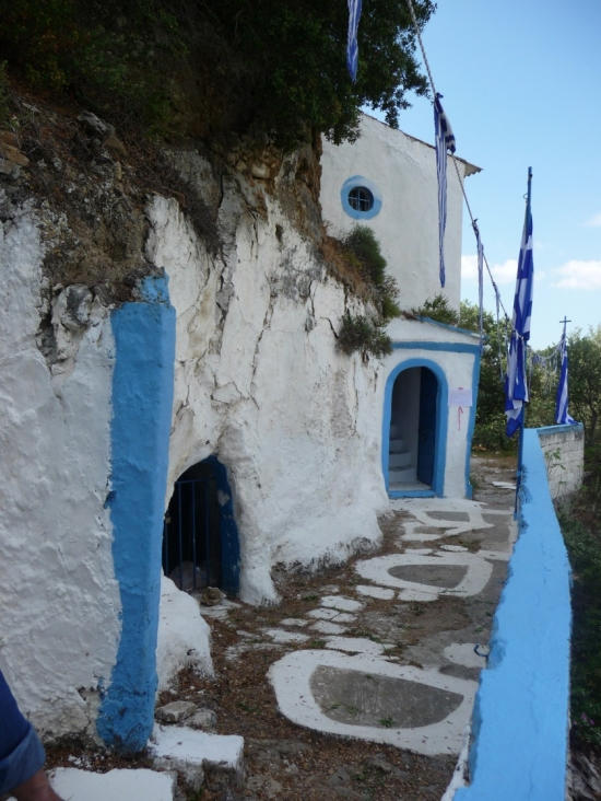 Eigenlijk wilde ik daar wel even heen. Een Griekse moeke maakt een wijds gebaar en tilt het lint op. Een, dikke grillige, eeuwen oude, olijfboom staat langs het oneffen pad naar boven. Daarna grof uitgehakte treden en ruwe flagstones. Er is net een dienst aan de gang. Je moet toch goed gelovig zijn om helemaal naar boven te gaan, want het is een hele klim.