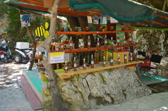 Beneden, bij de parkeerplaats, is een kraampje waar honing verkocht wordt en er is een leuk terrasje onder de bomen waar je wat kunt eten en drinken.