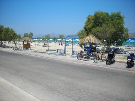 We gaan verder naar het gezellige drukke Tigaki. Maar daar is het dan ook een toeristenplaatsje voor. Veel winkeltjes, hotels, appartementen en restaurants. Een grote lap strand is hier veel breder en er groeien zelfs een soort dennen. Het bruist dan ook van de levendigheid, vooral in de avond. Aan de horizon eiland Pserimos, met een grote Griekse vlag op de rotsen.Net buiten de plaats ligt, in een vrij vlak en dor gedeelte, een zoutmeer. We stallen de fietsen en kuieren wat rond.