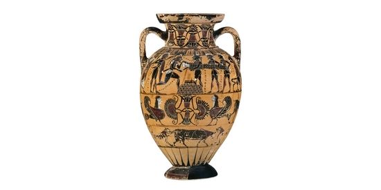 Rond dezelfde tijd ondstond de zgn. ‘zwartfigurige stijl’. Vazen werden met grote zwarte figuren beschilderd, tegen de rode terracotta ondergrond. Details, zoals de anatomie en gezichtsuitdrukking werden in de klei ingekrast, zodat er een soort dieptewerking ontstond.