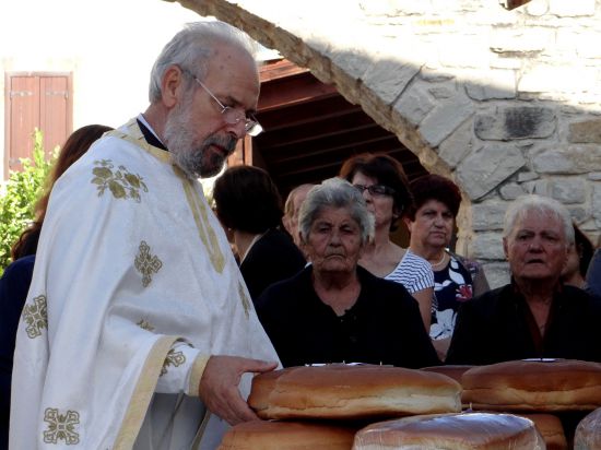 We bedankten de taxichauffeur en vroegen gelijk een kaartje met een telefoonnummer voor de terugreis. Meteen na het uitstappen zag ik ‘moeder’ Evangelia druk bezig voor haar huis. Een taxi in dit dorp is best opvallend dus toen we uitstapten rende ze naar ons toe. Wat een welkom! Zij vertelde in vloeiend Vlaams dat zij de voorbereidingen aan het treffen was voor de plechtigheid na de dienst. Zeg maar de catering. Voor het huis stonden de andere hulptroepen (ook familie) die de tafels mooi versierd hadden en waar later de rijst, schapenvlees en drank op zouden komen. Wat was dit een buitenkans dat we dit konden meemaken! We lieten Evangelia met haar hulp rustig verder werken en doordat de dienst nog wel anderhalf uur kon duren besloten we het dorpje beter te verkennen om daarna terug te keren naar Evangelia, want zij wilde ons in alle rust ontvangen en om ons kennis te laten maken met de rest van de familie. Natuurlijk waren we benieuwd naar ‘de verjaardag van Agia Pelagia’. Het was een drukte van belang. Via de ramen kon ik zien dat het bomvol was en door de luidsprekers die overal stonden opgesteld hoorden we de Papas de dienst leiden. Voor een twintigtal mensen was er binnen plaats en buiten volgden vele mensen op bankjes de dienst. Op het pleintje voor het kerkje stond een tafel met brood dat na de dienst gezegend moest worden.
