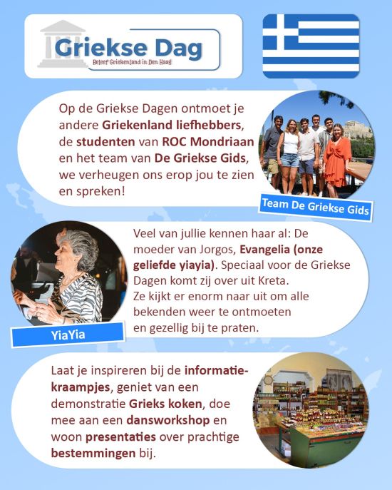 Bezoek op vrijdag 31 oktober en/of zaterdag 1 november de Griekse Dag van de Griekse Gids (Locatie: ROC Mondriaan, Helenastraat 10, 2595 HA Den Haag.) Vrijdag van 16.00 tot 20.00 uur. Zaterdag van 10.00 – 13:00 of van 14:00 tot 17:00 uur.