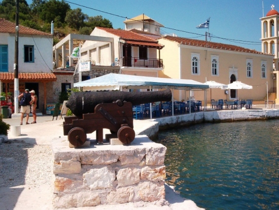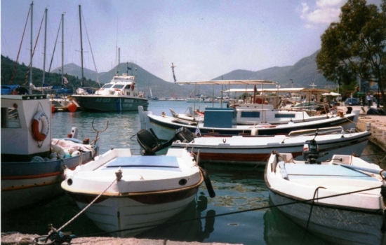 Niet ver buiten Lefkas ligt een wat kleiner eiland, n.l. Meganissi. Je kunt er komen met een kleine veerboot. Die doet daar twee plaatsen aan. Dat leek ons wel een aardig plan om een dag naar toe te gaan, de scooters mee natuurlijk. De auto’s gaan achteruit de boot op. Plots klinkt het verlossende signaal. De trossen gaan los, klep omhoog. Het schip zet er meteen de flinke vaart in. Een half uur later meren we af in Spartochori, dat tegen een lage heuvel is gebouwd. Vanaf hier gaat de pont nog naar Vathi. Wij schepen uit en doen dat per scooter. Een leuk tochtje. De weg door het stadje is smal, er kan amper een bus langs. Veel vrouwen in het zwart. Een oma strompelt met een zak houtskool op haar hoofd het terras op, gooit de zak in een hoek. Ze gaat puffend in een beschut hoekje zitten. Wij gaan door naar Vathi en zoeken later ergens een strandje op om te luieren, zwemmen en te snorkelen. Daarna is het wachten op de pont, dat doen we bij een overdekt terras op de kade, nabij een kerk.