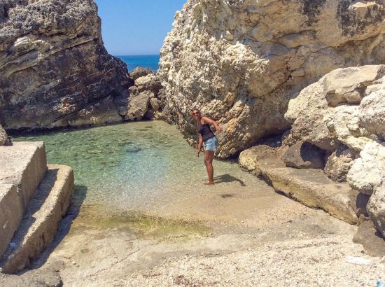 We zetten de scooter neer en lopen verder naar boven en zien op de top het oude klooster “The Blessed Virgin Maria”. In de diepte zien we het water tegen de rotsen klotsen, het waait nog aardig dus het is een gaaf gezicht. Naar beneden gereden nemen we feta saganaki met water in de Yialosbar, een restaurant dat van dezelfde eigenaar is als Dolce. We zitten één meter van het smalle strand en vijf meter van het water. Het is hier zo druk dat er geen strandstoeltjes meer te krijgen zijn. Er zitten hier overigens alle nationaliteiten. Je hoort de meest vreemde talen om je heen al zijn volgens ons de Italianen wel in de meerderheid. Na de eenvoudige, maar heerlijke lunch nemen we een lekkere duik in de baai voor ons. Wat een luxe deze plek!
