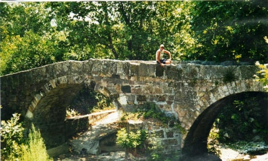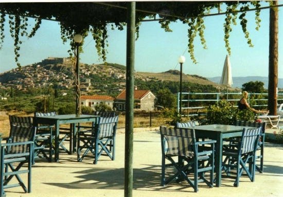 Via het dorpje Vaveios de berg op. Rechts sjokt een oude man met een ezel het keien pad op naar een waterput. De omgeving is fraai en heel groen. Er is regelmatig een slecht stuk weg, vooral bij het dorp Argenos. Langs de weg staat een armoedige taverne, maar wel op en top Grieks. Het is goed toeven onder de pergola, die weelderig begroeid is met druivenranken,. Om ons van drinken te voorzien, doet de ober kalm aan. We hebben de tijd, nu kunnen de bilspieren even ontspannen.