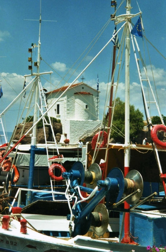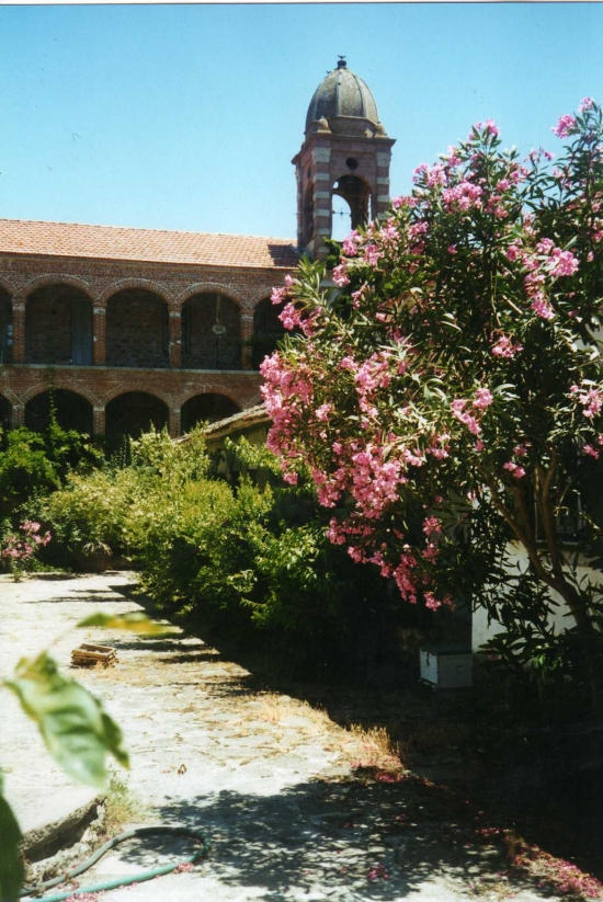 Ook dit jaar hebben we scooters gehuurd. Op weg langs de kust. Met de gezellige dorpjes Petra, kerk op rots en Anaxos, waar we kleine schildpadjes ontdekten in een smal stroompje naar zee. Dan bergopwaarts, langs de weg veel dennenbomen. Na veel klimmen en dalen belanden we in het dorp Filia. Hier drinken we wat. Binnen is het een grote chaos, op een ouderwetse jukebox staan oneerbiedig kratten gestapeld. Het vrouwtje dat ons bedient heeft vele beurten bij de tandarts overgeslagen. Na een bochtig parcours zien we plots een klooster in het groene dal; Moni Leimonos. Het is vrij rustig, dus de kans om op ons gemak het fraaie bouwwerk, van binnen en buiten te bezichtigen.