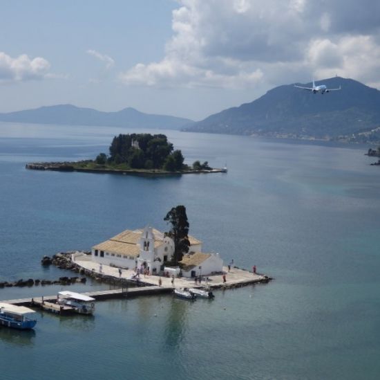 Opnieuw vroeg wakker, raam open en kijken wat voor weer het vandaag is. Er hangen lichte wolkenflarden, maar de zon breekt al snel door. Dat beloofd veel goeds. We hadden besloten om vandaag weer met de bus naar de stad te gaan, nu naar Kanoni het hoogste punt van het eiland, nabij de landingsbaan. We staan amper bij de halte of de bus komt al aanrijden. Het is rustiger dan vorige keer en kunnen zelfs zitten. Maar onderweg wordt er toch nog een aantal malen gestopt. We stappen uit bij het plein waar alle bussen aankomen. Daarna naar het Esplanada, het drukke plein bij de Liston.-arcaden. Ook daar komt de bus net aanrijden. Een kort ritje naar het groene schiereiland Analipsis.. Af en toe heeft de bus moeite om door het drukke verkeer te komen. Na ruim tien minuten stoppen op het hoge uitkijkpunt. Er is een restaurant met groot terras. We gaan zitten op een schaduwrijk plekje met rechts de landingsbaan, voor ons de verbindingsdam. Aan de linkerkant beneden aan het water het bekende Vlachernaklooster en wat verder in zee het eilandje Pontikonissi. We zitten net heerlijk aan een kop cappuccino, als er een toestel van TUI met donderend geraas binnenkomt. Niet veel later kiest een Engels toestel van Thomas Cook het luchtruim. Ank wijst naar beneden. “Zullen we daar nog even naar toe?” Daarvoor moeten we wel naar beneden. Maar nergens een trap te bekennen. Dan maar langs de hellende weg, waar we met de bus langs kwamen, gaan we naar beneden. We wandelen zoveel mogelijk langs de schaduwrijke kant. Er liggen een aantal kleine boten te wachten op toeristen, die naar het verderop gelegen muizen eiland Pontokanisi willen. We kopen een kaartje en stappen in het voorlopig lege bootje, dat aan een houten steiger ligt. Wanneer er plots een buitje valt, is de boot snel vol met een groep Zweedse toeristen, die met een gids bij het kerkje vandaan komen. De trossen gaan los en dan pruttelt het scheepje de zee op. Het is inmiddels weer droog en de zon schijn volop. Het is hooguit tien minuten varen. Als de schippert aanmeert waaiert de groep uiteen, maar het grote deel neemt de uitgehouwen trap naar het kleine koepelkerkje uit de 11e eeuw, dat boven op de heuvel tussen het groen staat, met veel cipressen. Hier zijn de meeste bomen gekapt, uit veiligheid voor de dalende vliegtuigen. Om er te komen moeten we dus veel treden op.. Er is ook een klein winkeltje, met souvenirs en kleine snuisterijen. Maar ook wordt er drinken en ijs verkocht. Op een verhoging heb hier een prima uitzicht op de zee, naar ook op de dam en de daar achter gelegen start en landingsbaan. We nemen een kijkje in de kleine gebedsruimte, waar niet veel mensen de dienst kunnen bijwonen. Het ziet er fris en proper uit en hangt vol religieuze voorwerpen en schilderijen. Als er een kort signaal klinkt gaan de toeristen massaal naar benden. Wij wachten nog even, want er is een regelmatige pendeldienst. Ank neemt plaat op de stenen muur rond het eilandje en ik loop een rondje over de ruim een meter hoge en brede muur. Het eiland is toch groter dan ik dacht, Ank zit al ongerust te wachten, want er heeft net een bootje afgemeerd voor de achterblijvers. We nemen snel plaats en varen terug. Als we uitstappen loopt Ank meteen naar het kleine witte kloostertje en daarbij behorende winkeltje, waar we ook naar binnengaan. Het kerkje is niet meer in gebruik, maar heeft nu meer bezoekers, dan de gelovigen die de kerkdienst ooit bezochten. Hierna weer de weg naar boven naar de bushalte, langs de kleine huisje die op de landingsbaan uitkijken. De bus rijd ons net voorbij en ik steek mijn hand op. Bij de halte staat de bus gelukkig nog te wachten. De rit gaat door buitenwijk van Kerkira, met veel groen langs de weg, maar ook enkele hotels en statige huizen.