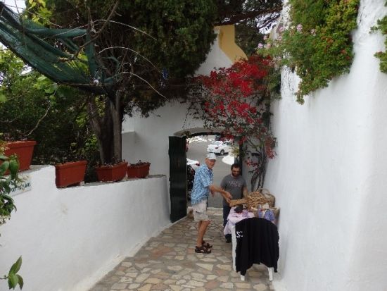 We hadden gisteren een afspraak gemaakt om in het restaurant te ontbijten. Er is ook een miniwinkel, waar we de nodige boodschappen halen. Na de koffie gaan we naar Gouvia, om de boel te verkennen. We lopen de licht hellende weg op, waar nog veel zaken gesloten zijn. Aan de linkerkant is een fraaie oprijlaan naar het Corcyra beachhotel. Aan de rechterkant staat de fraaie Agios Pantes kerk. De weg maakt een flauwe bocht waar een palmboom midden op het kruispunt staat. Daarna slaan we in de nog rustige winkelstraat in. Er zijn veel taverna’s, bars en souvenir winkeltjes. Hier slenteren we wat rond en lopen de zijweg in, die gaat naar Govino Beach. Een smal strand, waar de bedden hoog opgestapeld staan. Het zonnetje schijn behoorlijk en daarom zoeken we een schaduwrijke plek bij de strandbar van een hotel om wat te drinken. Het is nog niet druk. Enkele gasten van het hotel zitten nog aan de frappe. koude koffie met ijs. Andere hangen lui op de banken. Ouders met kleine kinderen lopen bepakt en bezakt naar het strand. Op de terugweg gaan we achter het hotel langs. Een slecht stukje zandpad gaat door het bos en komt bij de baai achter het complex uit. Het is er nog rustig. We steken het grasveld over. Bij het zwembad liggen al zonaanbidders, er wordt druk gesmeerd. We lopen lover het grasveld tussen de palmen door naar de smalle reep zand en komen op de weg bij de voorkant van het appartement. Via het natuurstenen pad komen we dan aan de achterkant. Vijf treden op naar het verhoogde bordes.