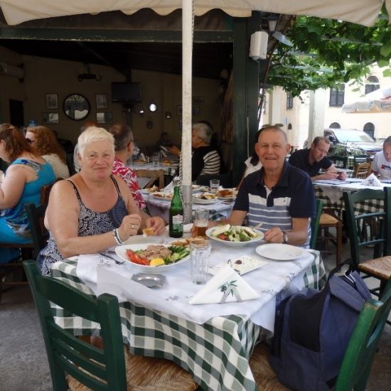 Aan de andere kant van de weg een lange rij aaneengesloten terrassen. Achter de grote parkeerplaats vol auto’s en de oude burcht. Daar laten we ons op de foto zetten. Tijd voor de rondrit. Er zijn meer toeristen op het idee gekomen voor het ritje van 25 minuten, gelukkig zijn in de achterste wagon nog plaatsen. In drie talen worden we op de hoogte gehouden wat we zien. Goed bedoeld, maar slecht te verstaan. Het is een aardig ritje langs diverse bezienswaardigheden. Op de terugweg naar de bushalte, gaan we door de oude stad, smalle straatjes en ontelbare souvenir winkeltjes en veel taverna’s. Het is er druk bevolkt en de zon schijnt volop. In de nabijheid van de Spiridonkerk, op het terras van een gezellige bistro, nemen wat te drinken, met een hapje er bij. Dan opnieuw slenteren door de wirwar aan stegen en straatjes naar het centrum. De bus naar Gouvia staat al klaar.