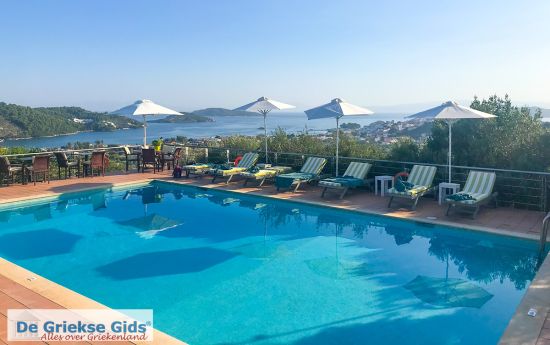 We zetten ‘Google maps’ aan die ons de weg zal wijzen naar onze accommodatie die net buiten Skiathos-stad. gelegen is. Na enkele minuten rijden zijn we er al en kunnen we inchecken. Dit gebeurt bij de poolbar. Zo kunnen we gelijk het prachtige uitzicht bewonderen vanaf deze plek bij het zwembad. Wat is dat ontzettend mooi! We hebben vanaf hier uitzicht op de stad, de blauwe zee en op de korte landingsbaan van het bekende vliegveld van Skiathos. Wij vinden het altijd erg leuk om vliegtuigen te zien landen en opstijgen, dat is zo’n mooi gezicht. We worden vriendelijk welkom geheten door de dame die achter de poolbar staat en ze geeft ons direct enkele tips over de omgeving, terwijl ze ons de kamer laat zien waar we de komende paar dagen zullen verblijven. Het is een fijne, nette kamer, met een goed bed, een goede douche en een airco, deze drie zaken vinden we altijd erg belangrijk als we op vakantie in Griekenland zijn. We besluiten dat dit zeker een accommodatie is die we gaan aanbieden aan onze gasten van Griekse Gids Reizen, die naar Skiathos zullen gaan.