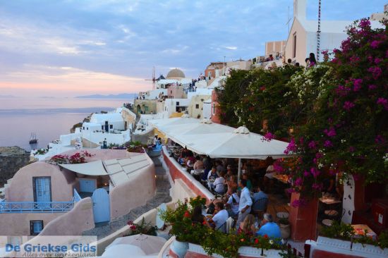 Wij gaan luchten op een terrasje en tja, hier liggen de prijzen een stuk hoger dan wat we normaal in Griekenland gewend zijn. Een Griekse salade voor tien euro, maar dan zit je wel op DE plek en we genieten ervan om op deze plek te zitten. Helaas wordt het tegen zonsondergang minder helder en wat bewolkt, maar toch blijft het een geweldige ervaring om met zoveel andere mensen te wachten op het “moment suprême”.