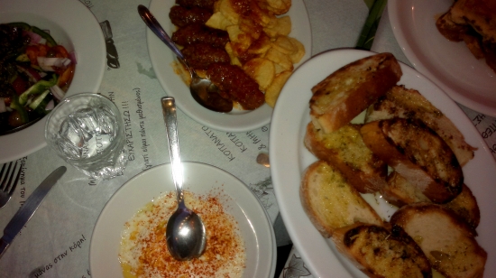 En de gouden tip……,ga uitgebreid eten op z’n Grieks. Bestel een glas ouzo of tsipouro en neem hier wat verschillende mezedes, een soort Griekse tapas, bij. Voor je het weet ben je in gesprek met de Griekse buren van het tafeltje naast je, staat er een nieuw glas ouzo naast je bord en is het gestopt met regenen.