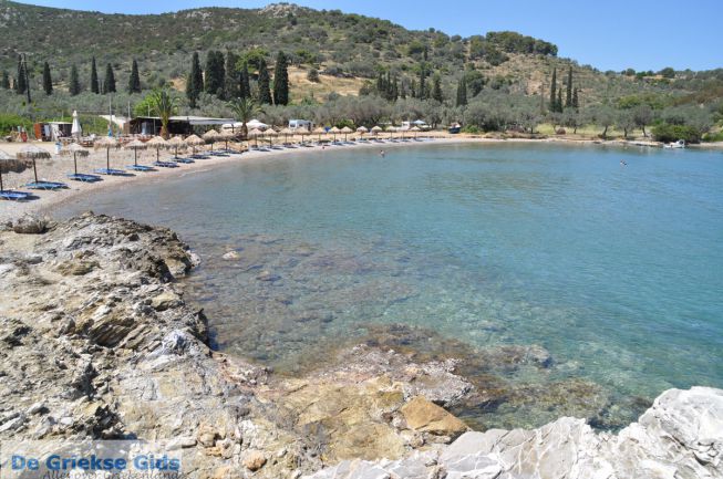 Vagionia baai Poros. Centraal in het noorden van Poros ligt de prachtige baai van Vagionia. Een bordje wijst je de weg naar Vagionia, een prachtig kiezelstrand in de gelijknamige baai. Dit strand is ideaal om te snorkelen. Aan het strand is een café-restaurant en overal zijn ligstoelen en parasols.